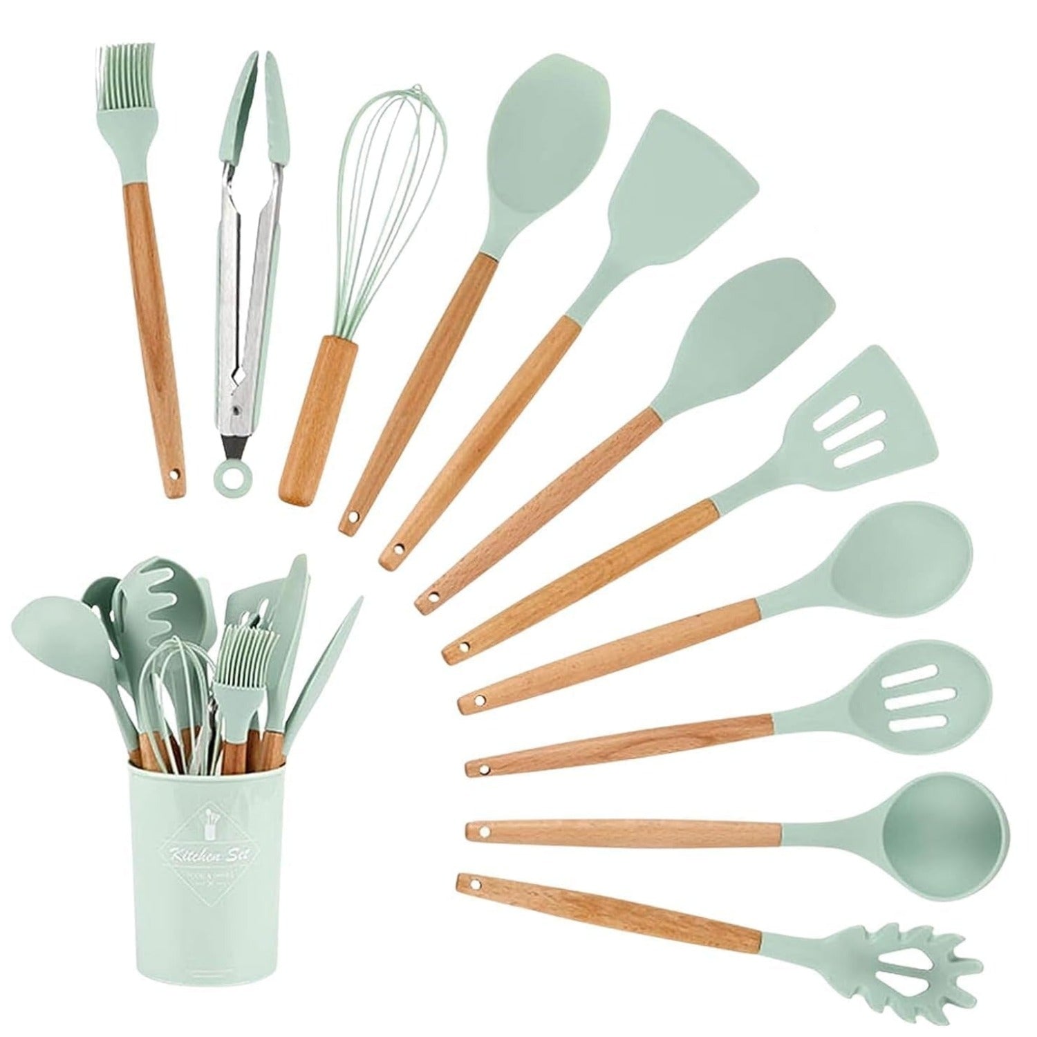 ✔ 12-Piece Complete Kitchen Set – Includes solid spoon, slotted spoon, soup ladle, pasta server, whisk, round spatula, spatula, solid turner, slotted turner, basting brush, tongs, and holder