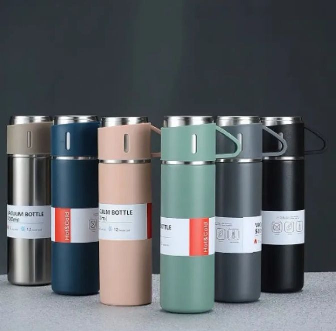 500ml Stainless Steel Vacuum Bottle Set | Hot & Cold Water Thermos (3pcs + 2 Cups)